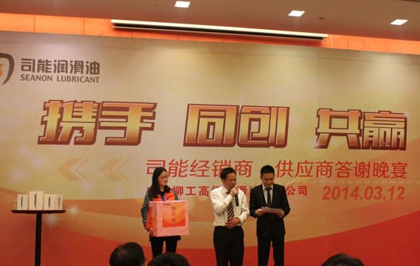 ??????? 2014年3月12日,在江苏溧阳御水温泉酒店内,一场盛大的订货会正在进行,这是广西柳工高级润滑油有限公司举办的一场以“携手 同创 共赢“为主题的大规模订货会。当天共计有120余人参与该活动。“司能”凭借其高品质放心油以及强大的公司实力赢得了客户的认同,当天一举拿下了近千万元的订单。