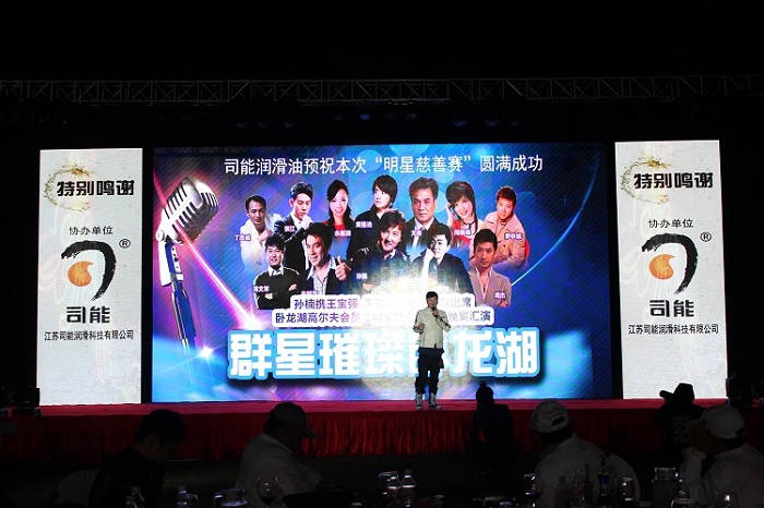 ? ? ? ?2014年12月15日晚,柳州卧龙湖高尔夫俱乐部隆重举办开业周年庆典暨会员“明星慈善邀请赛”,孙楠、王宝强、朱时茂等十几位明星齐聚柳州卧龙湖。高尔夫赛事、慈善晚宴、文艺汇演,司能润滑油作为协办单位倾情倾力,与群星共同呈现了一场璀璨摇曳的视听饕餮盛宴。