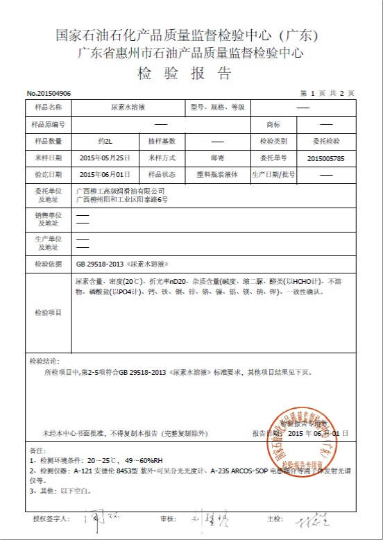 ? ? ? ? 2015年6月1日,我司的“驭蓝柴油尾气处理液”通过了第三方——国家石油石化产品质量监督检验中心(广东省惠州市石油产品质量监督检验中心)的检测,其中多个检测项目包括:密度、折光度、碱度、缩二脲含量、醛类指标、不溶物含量、磷酸盐含量,检测出来的指标都远远低于国家规定标准,其他的重金属铝、钙、钾、钠、铜、铁、镁、镍、锌、铬都均未检测出来,就连红外定性也与标准谱图一致,相关技术指标均符合国家GB 29518-2013《尿素水溶液》的严格标准,最后“驭蓝”顺利地拿到了合格的检测报告。