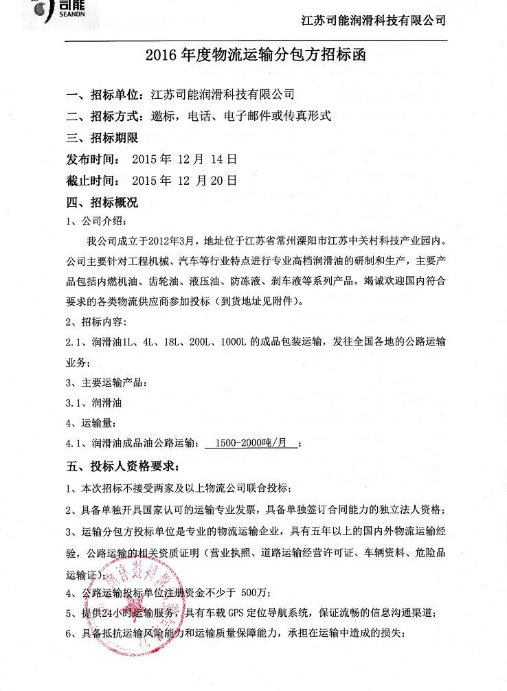 2016年度物流运输分包方招标函
