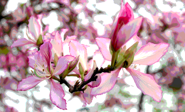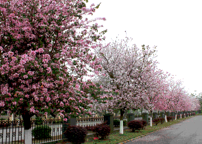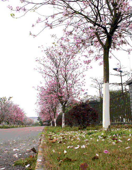 紫荆花的走道,一棵一棵的紫荆花树,一朵一朵的紫荆花朵,立在走道的两旁,特别有情趣、浪漫。紫荆花,怒放着,绚丽多彩。