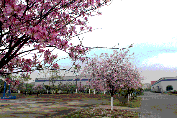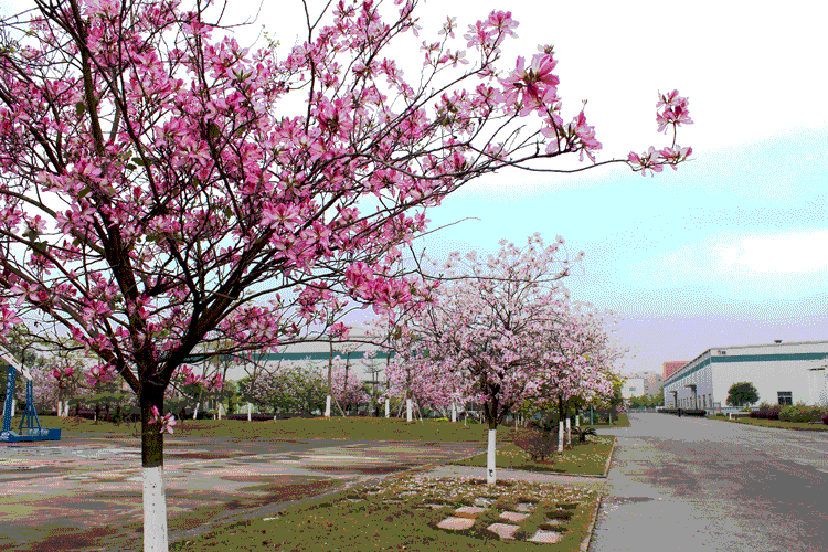 柳州基地里的紫荆花海,鲜艳绮丽,幽香扑鼻。身处办公楼里无须开窗,都会被浓郁的花香熏醉。