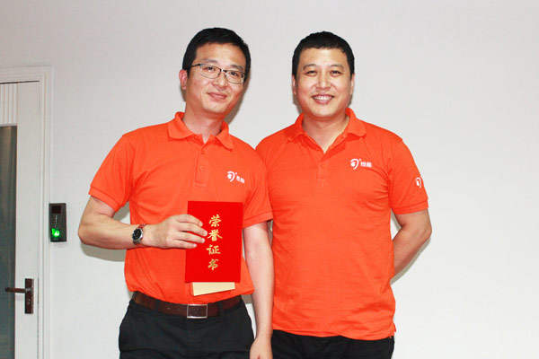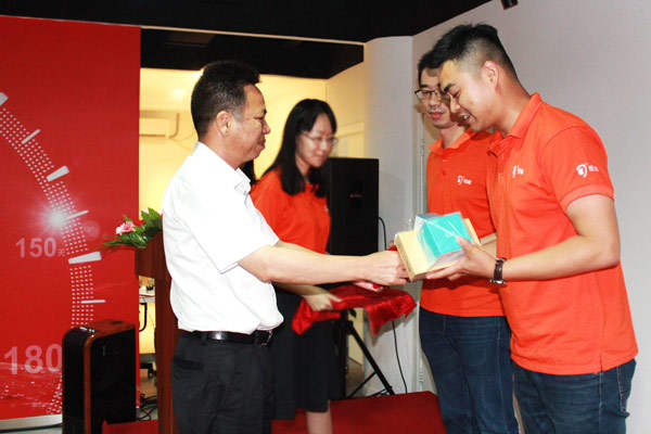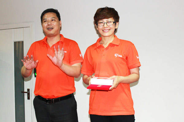 △总经理助理李绍英为大客户经理张剑锋颁发最佳进步奖。
