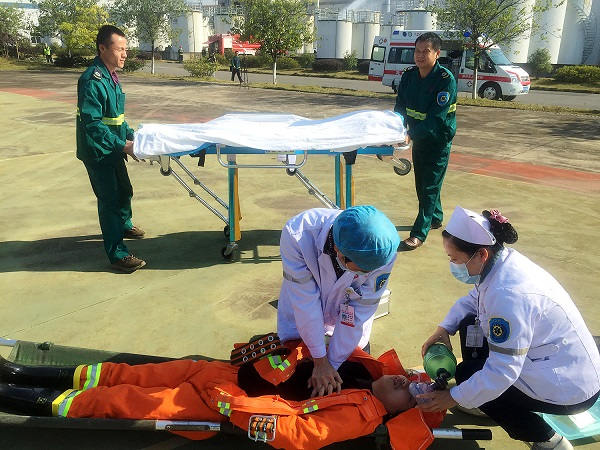 ? ? ? ? 演练现场设置在司能石油化工有限公司D401原材料储罐外,演练科目设置为员工在对储罐进行补焊作业时突发火灾,火灾现场临近柴油储罐,两名微型消防人员进行自救时受伤、昏迷被困现场。演练按先期应急处置,企业自救和紧急疏散,消防大队和120急救中心人员现场一起出动应急救援,污染排查,总结等五个环节进行。整个演练过程环环相扣,有条不紊,各应急队伍、救援队伍紧密配合,协同作战,最终成功控制了事故损失的进一步扩大,消除了事故的危害,获得了圆满成功。演练历时约1小时30分,共有95人参加演练,出动消防车6辆,120急救车1辆,以及安监、交警、环保等应急救援车辆3部。
